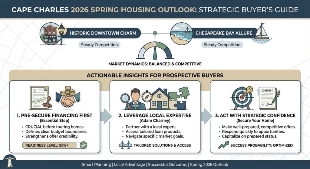 The 2026 spring season is shaping up to be dynamic. Buyers aiming to secure a home in Cape Charles need to act strategically. With the historic charm of the downtown district and the natural allure of the Chesapeake Bay, competition remains steady. It is crucial to have your financing in order before you start touring homes.
