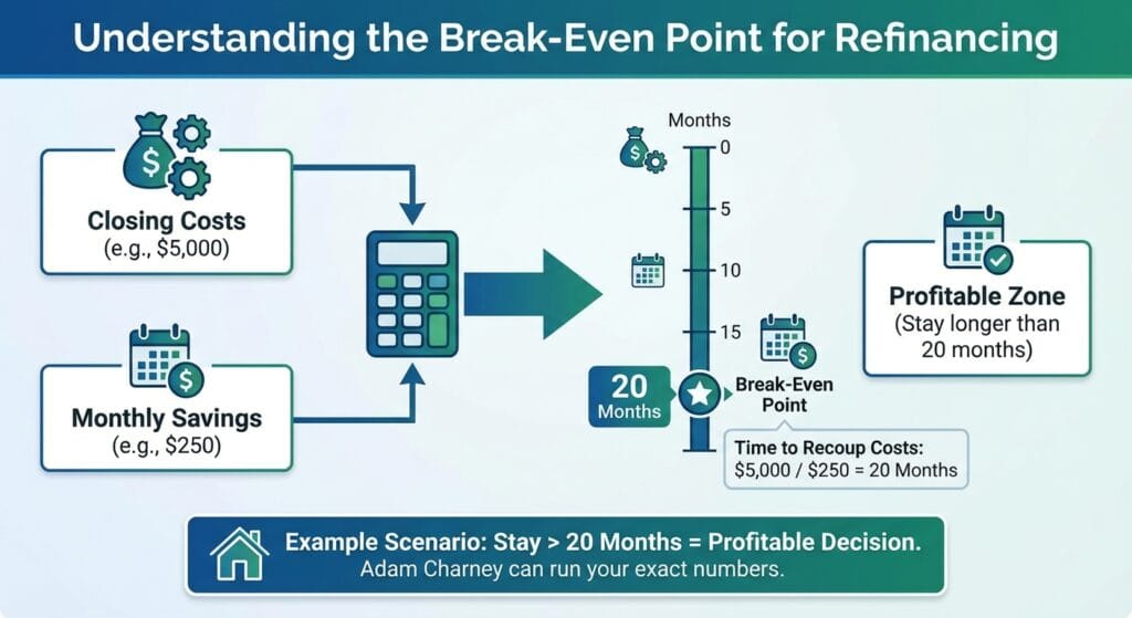 To find the break-even point, divide the closing costs by the monthly savings: $5,000 / $250 = 20 months.